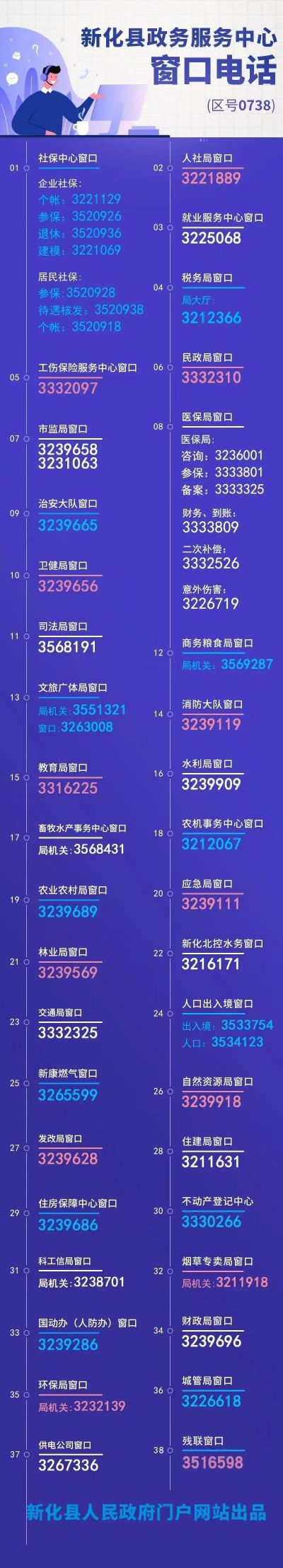 说明:关于新化县政务服务中心进驻机构各业务窗口电话一览表的信息作出特别说明:本信息立足为社会大众提供有价值的参考资料和办事指南等公共信息,部分图文来源于网络或者有关机构公开内容,属于公益性的分享与传播。虽然尽力确保内容的准确性和实效性,但由于各种因素,难免存在疏忽和差错,敬请不吝赐教,欢迎相互交流,共同学习。对信息中陈述、观点判断保持中立,版权属原作者所有,如涉侵权或者差错等问题,请联系网络信息推广平台秋果黄页网客服(187/8199/3958微信同号),一定会及时删除或者修正。谢谢!