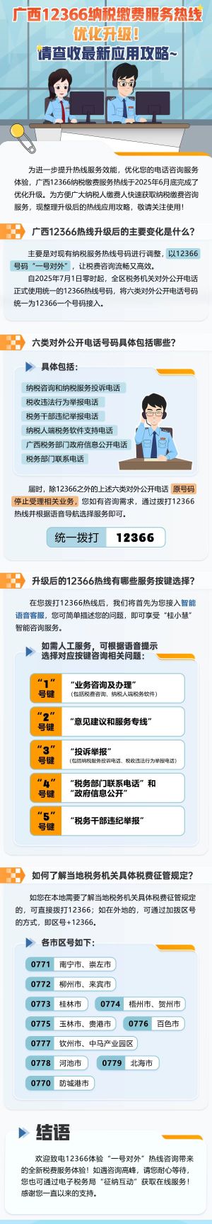 为进一步便利广大纳税人缴费人和社会公众联系税务部门,广西壮族自治区税务局决定,自2025年7月1日起,将广西全区税务部门纳税咨询电话、纳税服务投诉电话、税收违法行为举报电话、税务干部违纪举报电话、纳税人端税务软件支持电话、政府信息公开电话、税务部门联系电话等对外公开电话统一为“12366”一个号码。其中,税务干部违纪举报电话、政府信息公开电话、税务部门联系电话在工作时间受理。原对外公开的以上电话停止受理相关业务。特此通告。