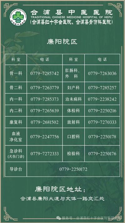合浦县中医医院廉阳院区地址和主要科室联系电话: