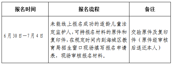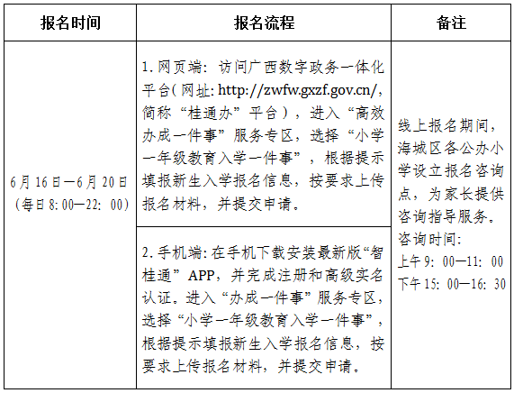新生只能选择线上报名或线下报名其中一种方式提交报名信息,重复报名无效。报名期间,家长可关注“北海市海城区教育局”微信公众号或登录“北海市海城区人民政府门户网站”,实时了解相关信息,认真阅读办事指南,按时完成报名工作。