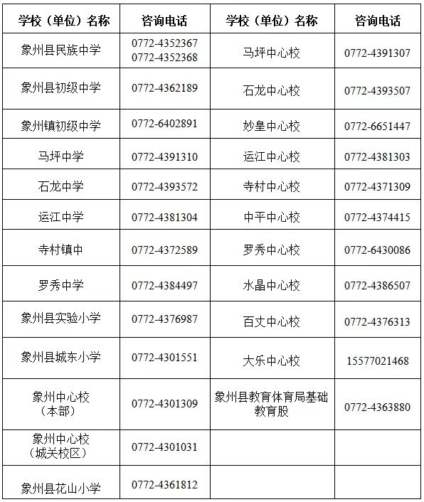 象州县招生工作举报电话:象州县教育体育局 0772-4305922。招生报名期间家长电话咨询及举报时间为8:00-18:00。