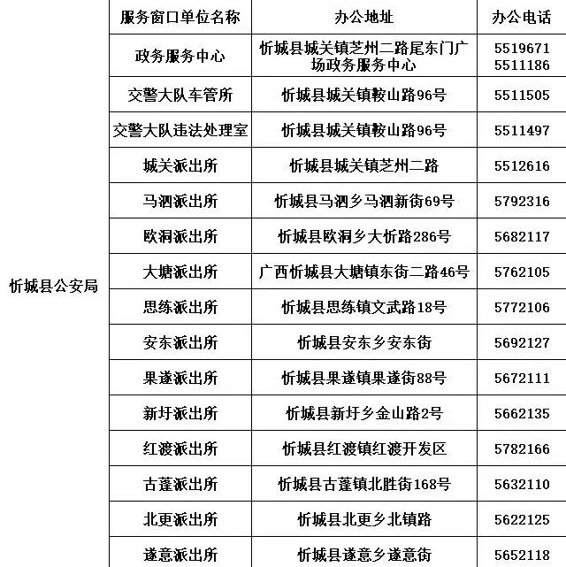 忻城县政务服务中心和各派出所户籍业务办理点咨询电话