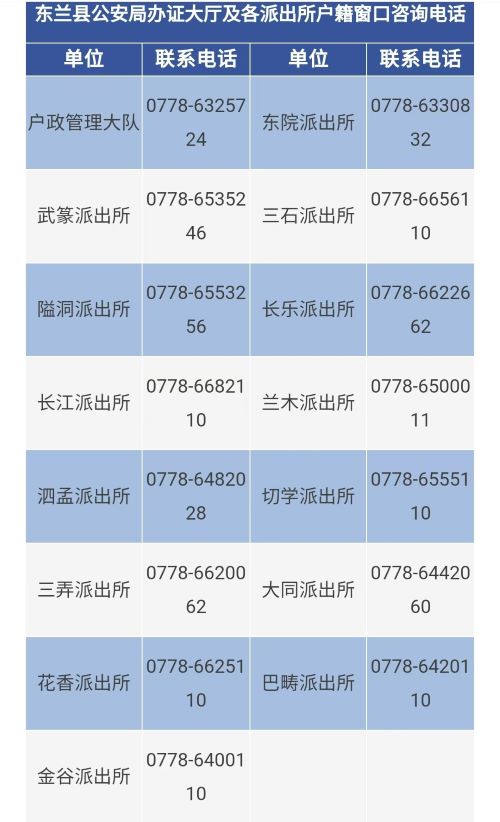 东兰县各个辖区派出所户籍窗口办证咨询电话汇总表:近期有办理户籍业务需求的群众,可以到户籍所在地派出所户籍室咨询办理,希望广大群众能合理安排业务办理时间,以免造成不必要的麻烦。