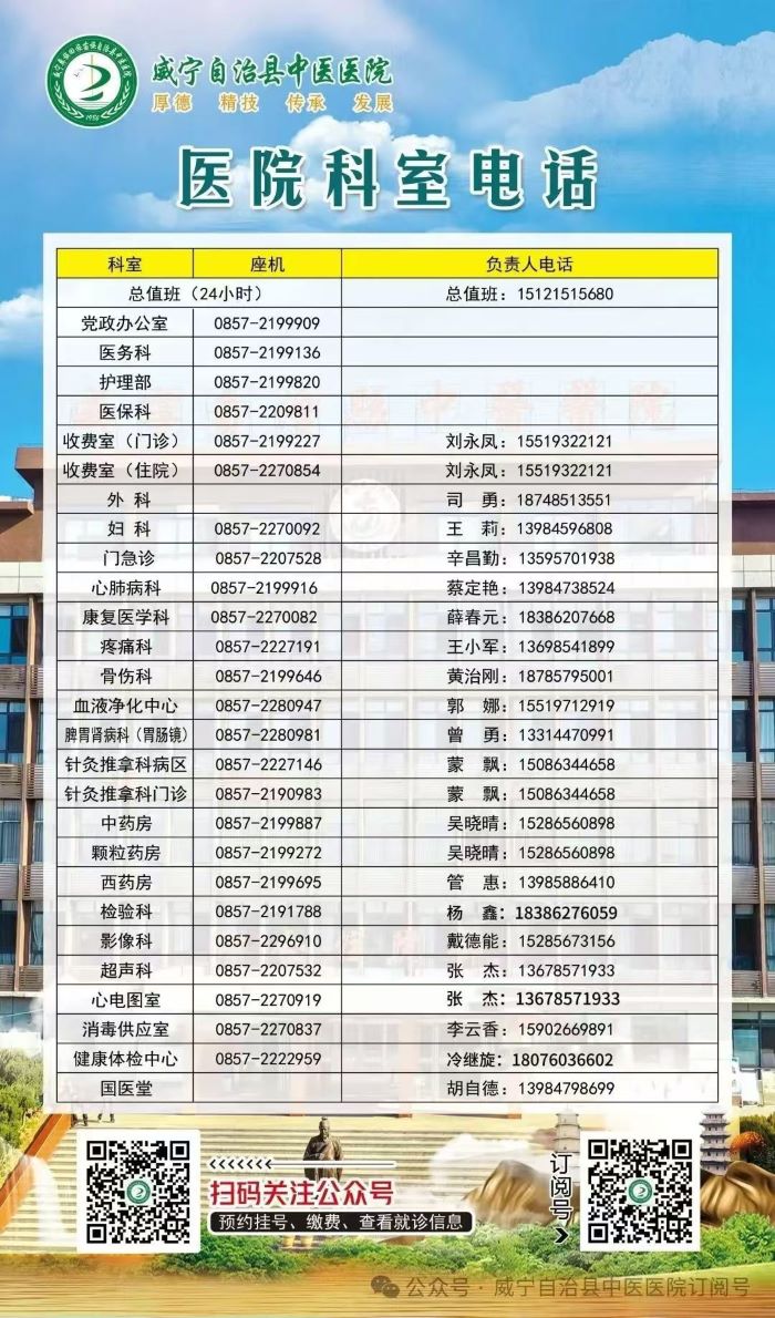 说明:关于威宁自治县中医医院各临床科室电话的信息作出特别说明:本信息立足为社会大众提供有价值的参考资料和办事指南等公共信息,部分图文来源于网络或者有关机构公开内容,属于公益性的分享与传播。虽然尽力确保内容的准确性和实效性,但由于各种因素,难免存在疏忽和差错,敬请不吝赐教,欢迎相互交流,共同学习。对信息中陈述、观点判断保持中立,版权属原作者所有,如涉侵权或者差错等问题,请联系网络信息推广平台秋果黄页网客服(187/8199/3958微信同号)。