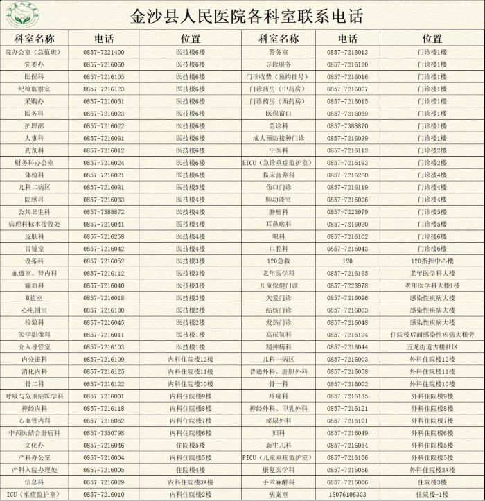 为了进一步提升医疗服务质量,方便广大市民就医咨询,现将金沙县人民医院各临床科室联系电话公布如下: