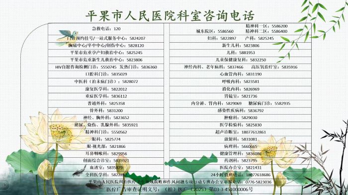 说明:关于平果市人民医院各科室咨询服务电话的信息作出特别说明:本信息立足为社会大众提供有价值的参考资料和办事指南等公共信息,部分图文来源于网络或者有关机构公开内容,属于公益性的分享与传播。虽然尽力确保内容的准确性和实效性,但由于各种因素,难免存在疏忽和差错,敬请不吝赐教,欢迎相互交流,共同学习。对信息中陈述、观点判断保持中立,版权属原作者所有,如涉侵权或者差错等问题,请联系网络信息推广平台秋果黄页网客服(187/8199/3958微信同号),一定会及时删除或者修正。谢谢!