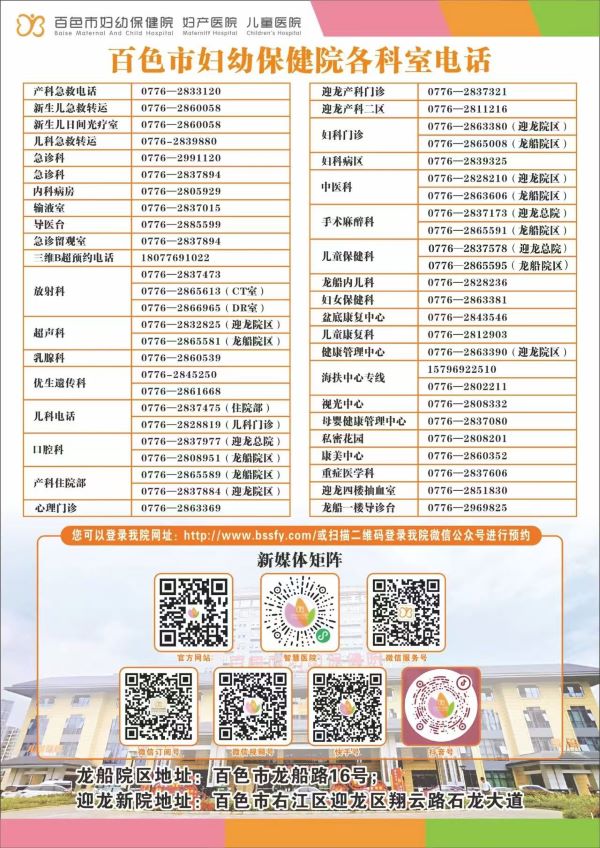 提示:关于百色市妇幼保健院各科室服务电话的信息作出特别说明:本信息立足为社会大众提供有价值的参考资料和办事指南等公共信息,部分图文来源于网络或者有关机构公开内容,属于公益性的分享与传播。虽然尽力确保内容的准确性和实效性,但由于各种因素,难免存在疏忽和差错,敬请不吝赐教,欢迎相互交流,共同学习。对信息中陈述、观点判断保持中立,版权属原作者所有,如涉侵权或者差错等问题,请联系网络信息推广平台秋果黄页网客服(187/8199/3958微信同号),一定会及时删除或者修正。谢谢!