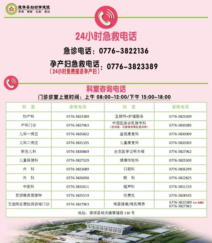 您好,以下是德保县妇幼保健院各科室咨询服务电话,如有任何建议或意见请及时给我们留言,我们将热心为您服务。感谢您的关注和支持,祝您健康!