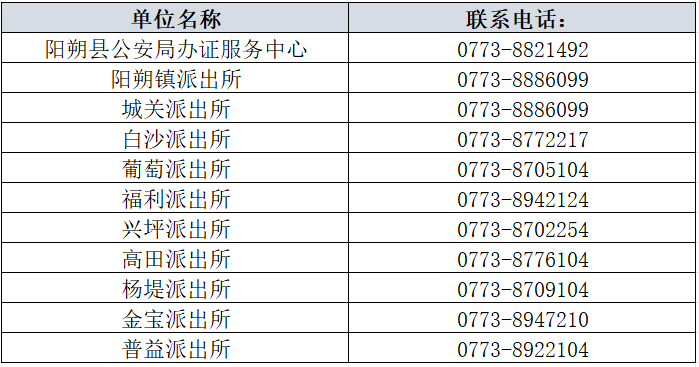如有特殊紧急办理事项,可拨打派出所联系电话,我们将开通绿色通道。节日期间,户籍业务网上平台正常办理,广大群众可通过微信小程序“桂警通办”线上申请办理。阳朔县各个属地派出所户政业务联系电话信息表如下: