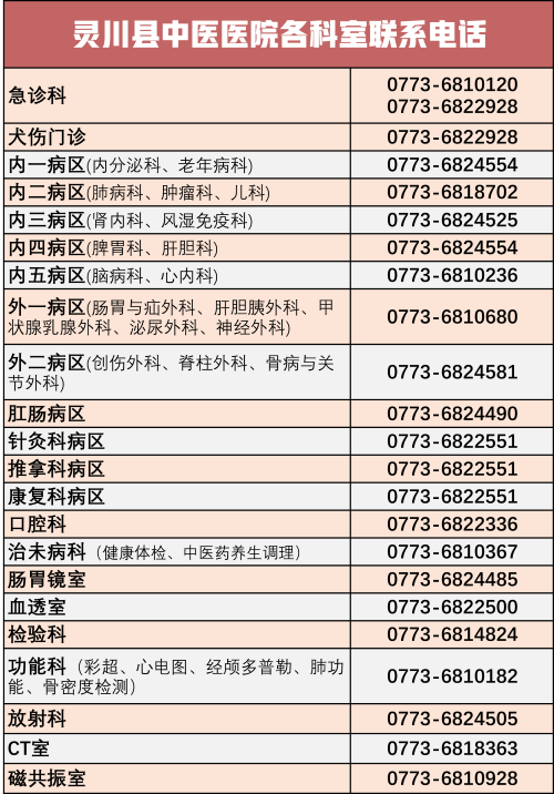 灵川县中医医院各个业务科室联系电话信息表如下: