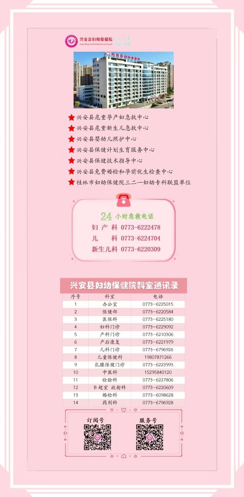 您好,以下是兴安县妇幼保健院科室电话通讯录,如有任何建议或意见请及时给我们留言,我们将热心为您服务。感谢您的关注和支持,祝您健康!