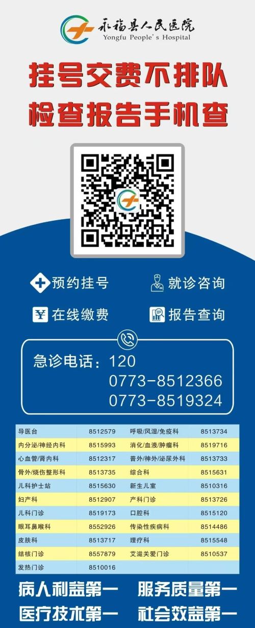 您好,以下是永福县人民医院各科室服务电话,如有任何建议或意见请及时给我们留言,我们将热心为您服务。感谢您的关注和支持,祝您健康!