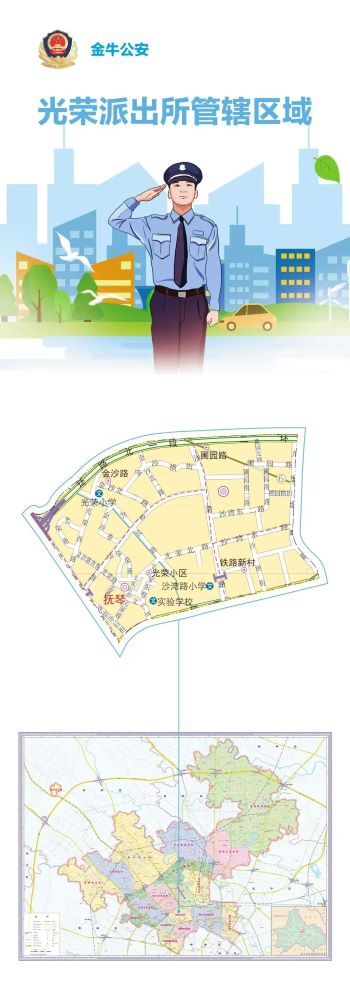 成都市金牛区光荣派出所管辖区域属于抚琴街道办事处,含金沙路社区、光荣小区社区、铁路新村社区、圃园路社区。办公地址:文家巷110号,报警电话:028-87656434