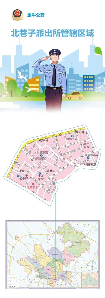 成都金牛区北巷子派出所管辖区域属于西安路街道办事处,含花牌坊社区、马家花园社区、永陵社区。办公地址:协和村10号,报警电话:028-87769110