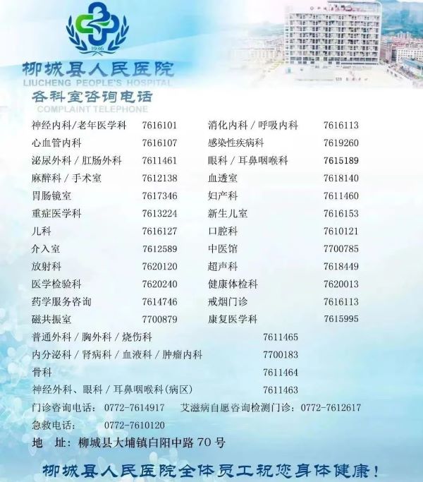 柳城县人民医院消化内镜室电话:7617346,柳城县人民医院健康体检科电话:7620013,柳城县人民医院关爱门诊电话:7612617,柳城县人民医院结防门诊电话:7616057