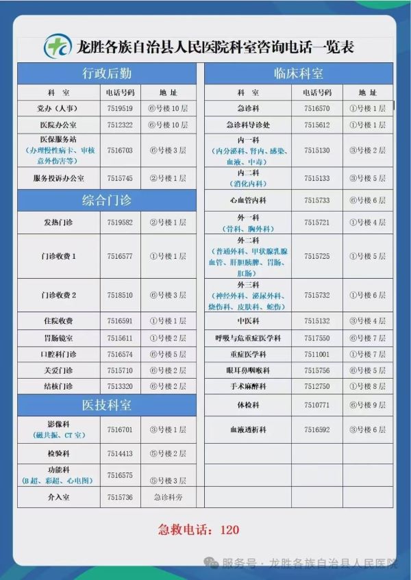 龙胜县人民医院科室咨询电话一览表如下: