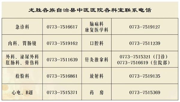 您好,以下是龙胜县中医医院主要科室联系电话,如有医疗业务请及时联系我们,我们将热心为您服务。感谢您的关注和支持,祝您健康!