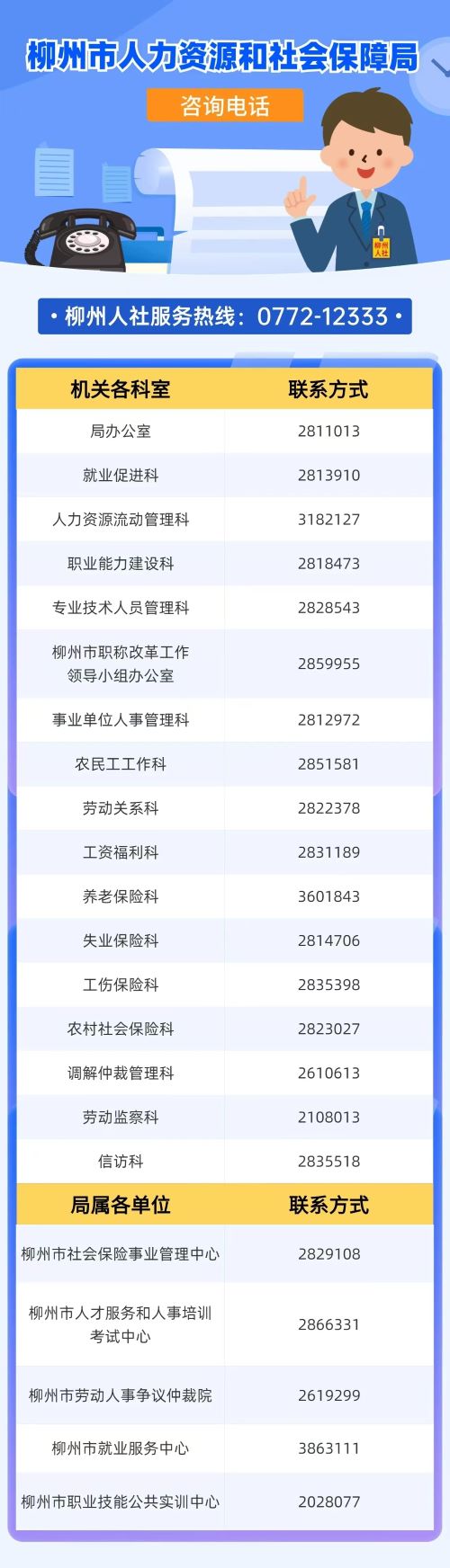 柳州市人力资源和社会保障局各职能业务咨询电话信息表如下: