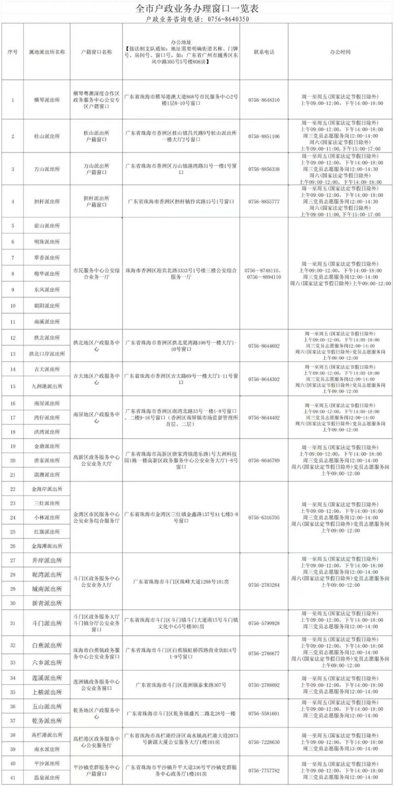 提示:关于珠海市全市各区基层派出所户政业务办理窗口办公地址和联系电话信息作出特别说明:本信息立足为社会大众提供有价值的参考资料和办事指南等公共信息,部分图文来源于网络或者有关机构公开内容,属于公益性的分享与传播。虽然尽力确保内容的准确性和实效性,但由于各种因素,难免存在疏忽和差错,敬请不吝赐教,欢迎相互交流,共同学习。对信息中陈述、观点判断保持中立,版权属原作者所有,如涉侵权或者差错等问题,请联系网络信息推广平台秋果黄页网客服(187/8199/3958微信同号),一定会及时删除或者修正。谢谢!