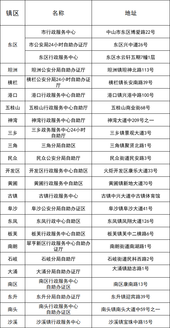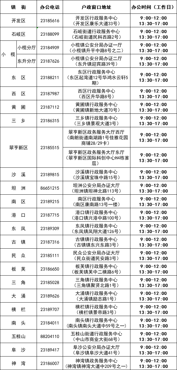 中山市全市基层户政窗口地址及咨询办公电话信息表如下: