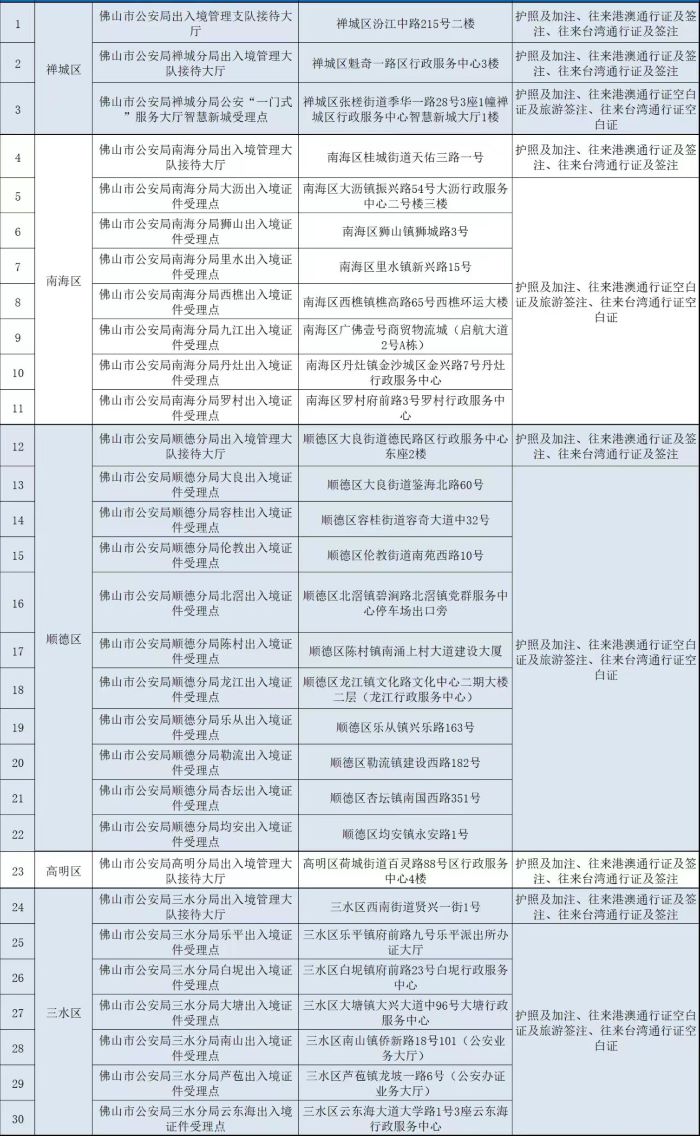 佛山市各区出入境办证服务点地址信息表如下:佛山市禅城区范围内各出入境办证服务点地址、佛山市南海区范围内各出入境办证服务点地址、佛山市顺德区范围内各出入境办证服务点地址、佛山市高明区范围内各出入境办证服务点地址、佛山市三水区范围内各出入境办证服务点地址。