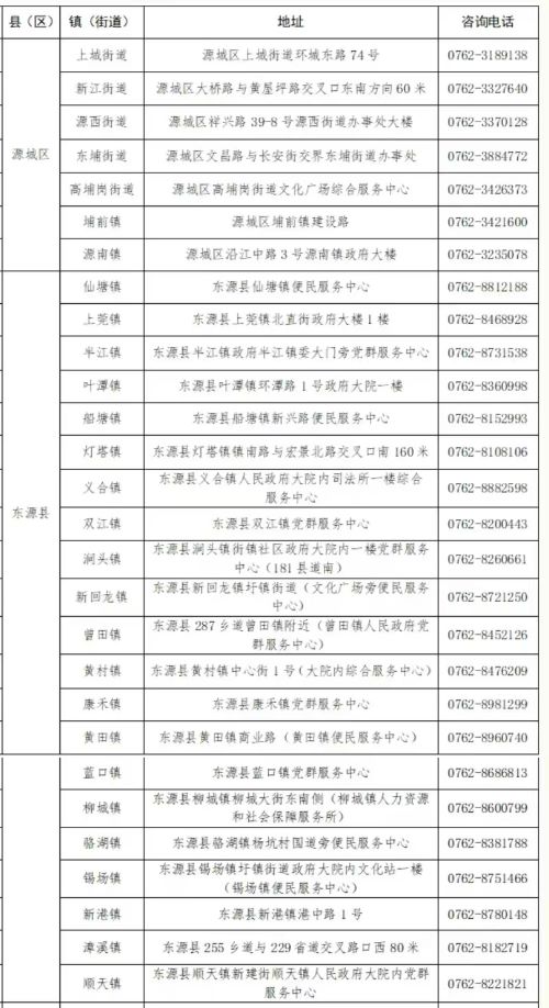 河源市各区县医保服务点(各镇(街道)城乡居民医保业务办理咨询电话和地址)信息表如下: