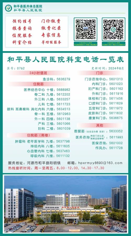 说明:关于和平县人民医院各业务科室电话一览表的信息作出特别说明:本信息立足为社会大众提供有价值的参考资料和办事指南等公共信息,部分图文来源于网络或者有关机构公开内容,属于公益性的分享与传播。虽然尽力确保内容的准确性和实效性,但由于各种因素,难免存在疏忽和差错,敬请不吝赐教,欢迎相互交流,共同学习。对信息中陈述、观点判断保持中立,版权属原作者所有,如涉侵权或者差错等问题,请联系网络信息推广平台秋果黄页网客服(187/8199/3958微信同号),一定会及时删除或者修正。谢谢!