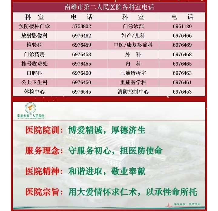 您好,以下是南雄市第二人民医院各科室服务电话,如有任何医疗需求请及时联系我们,我们将热心为您服务。感谢您的关注和支持,祝您健康!