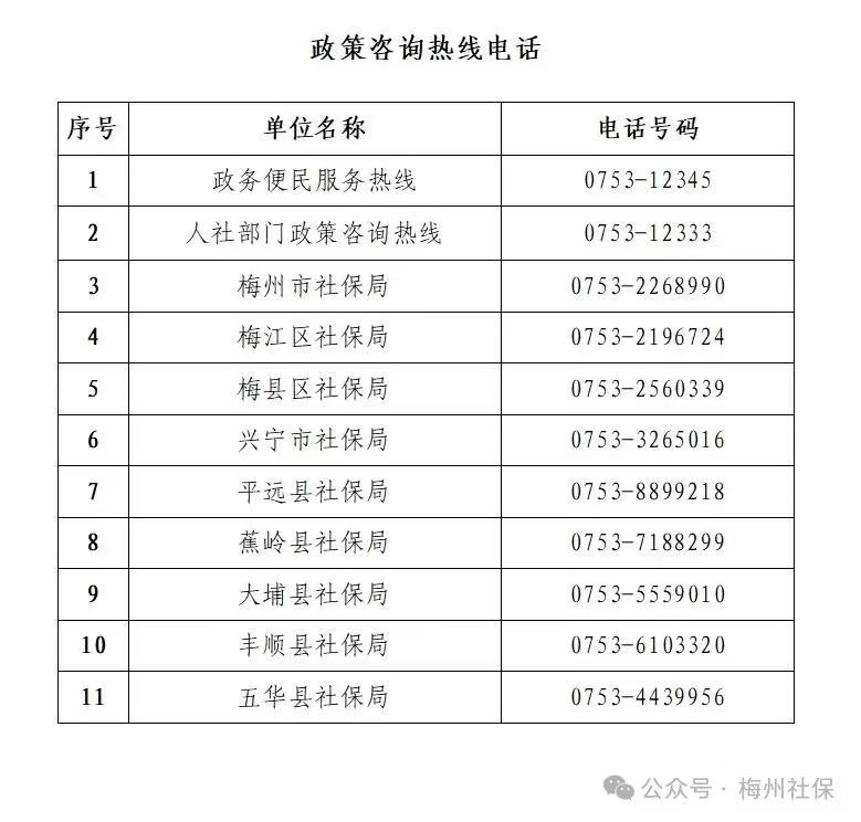 梅州市社会保险基金管理局社会保险关系科:0753-2263200