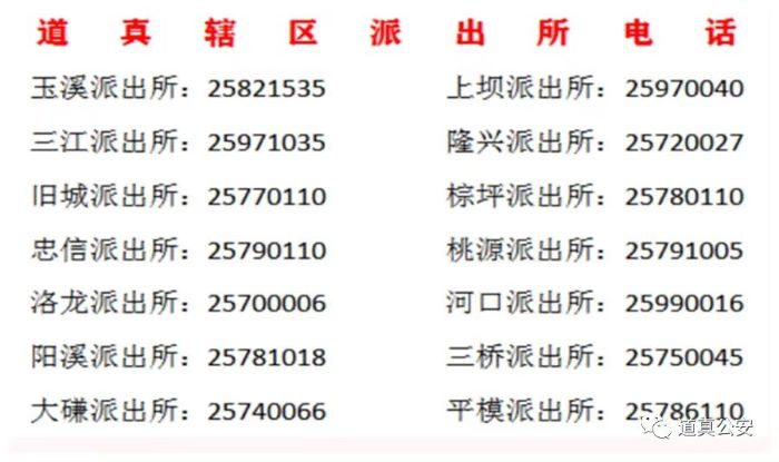 道真县范围内各属地派出所值班室电话,请记住或者收藏。为进一步提高服务群众的质量和效率,拓宽群众报警、咨询渠道。现将道真县范围内各属地派出所值班室电话进行公布,如有治安、刑事类报警、违法犯罪线索举报类问题,可直接拨打辖区派出所24小时值班电话。