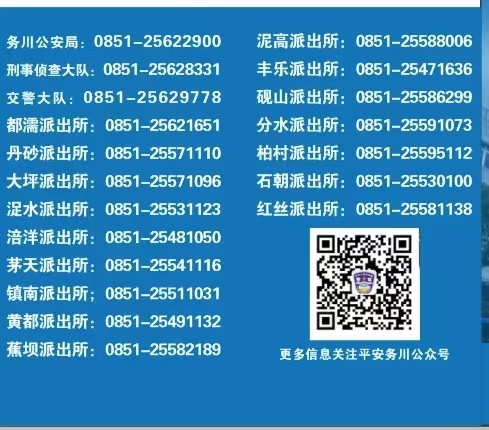 感谢大家长期以来对属地派出所工作的理解、关心和支持。务川是我家,平安靠大家。为了您和家人的平安,请您强化自我保护意识,加强防范能力,防止受到各种不法侵害。