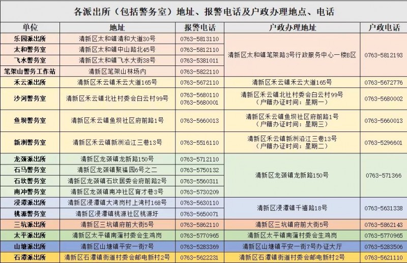 清远市清新区各派出所(警务室)地址及电话一览表如下: