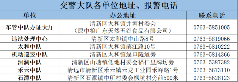 清远市清新区交警队办公地址及联系电话一览表如下: