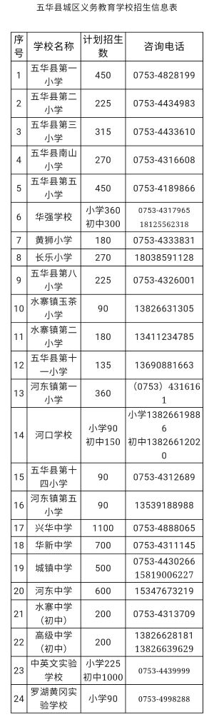 (四)在报名入学过程中如有疑问,请参考《五华县城区义务教育学校学位申请问答》(附件3),未提及的问题可联系拟报读学校咨询,各校招生计划和咨询电话详见《五华县城区义务教育学校招生信息表》。县教育局业务咨询电话:0753-4432680,监督电话:0753-4437940。