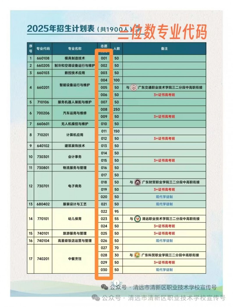 在2025年清远市中考志愿填报系统填报志愿。以下是我校各专业相关信息一览表(请对照以下相应专业代码填报)