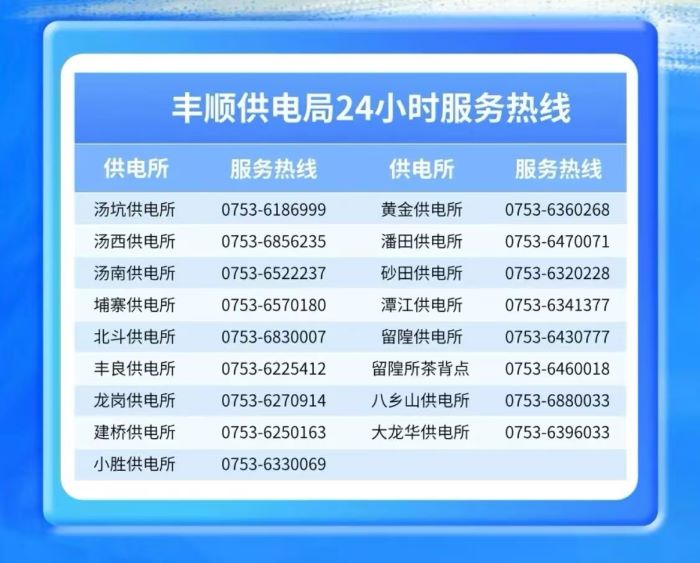 为了防患于未然,大家在使用电器时,不要违规用电,不要私拉乱接线,不得使用大功率违规电器,家里无人切断电源,做到人走电断,杜绝火灾隐患。如有用电问题可及时联系您的专职客户经理或供电所24小时服务热线,感谢您的理解和支持,您的十分满意是我们前进的动力。丰顺县供电局各供电所24小时服务热线信息表如下: