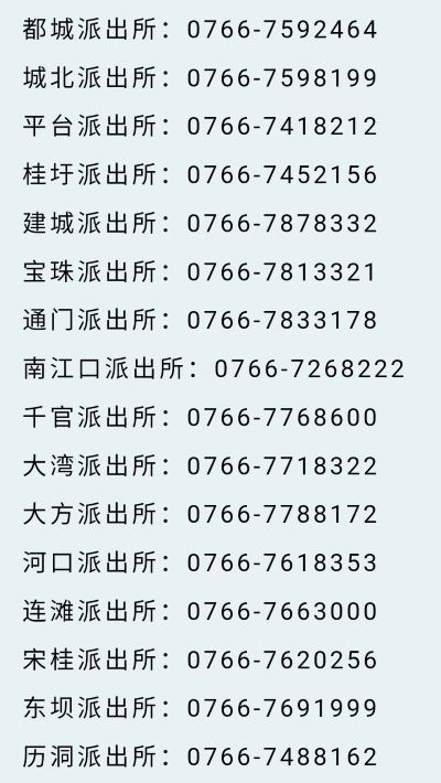 3.平台派出所:0766-7418212;4.桂圩派出所:0766-7452156;