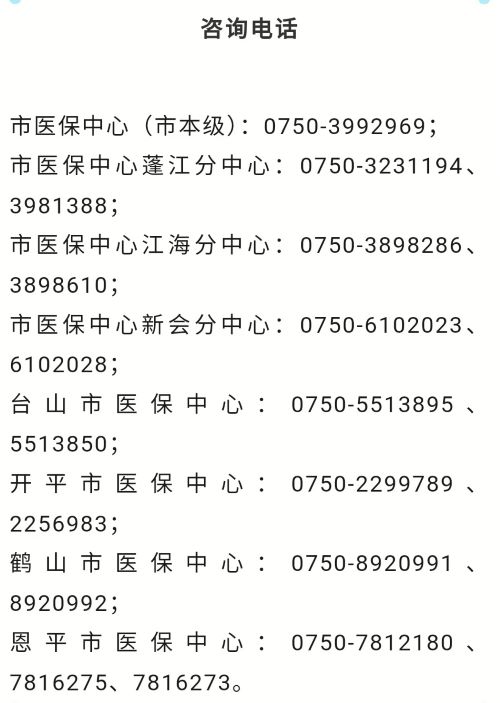 市医保中心(市本级):0750-3992969;市医保中心蓬江分中心:0750-3231194、3981388;市医保中心江海分中心:0750-3898286、3898610;市医保中心新会分中心:0750-6102023、6102028;台山市医保中心:0750-5513895、5513850;开平市医保中心:0750-2299789、2256983;鹤山市医保中心:0750-8920991、8920992;恩平市医保中心:0750-7812180、7816275、7816273。