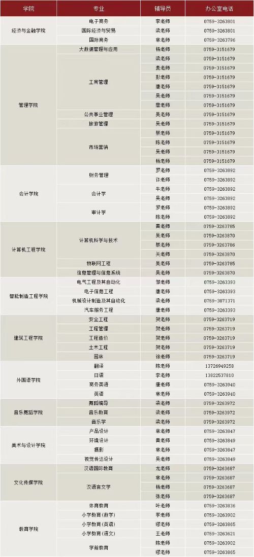 报到咨询电话:0759-3263783(学生工作处)财务咨询电话:0759-3151989、3263373(计划财务处)招生咨询电话:0759-3151699、3263787(招生就业处)校园网咨询电话:19124879141、18022628276(学生服务中心)