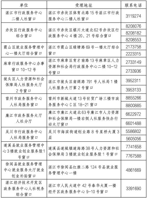 湛江市个人创业担保贷款及贴息业务各县(市、区)受理窗口联系方式