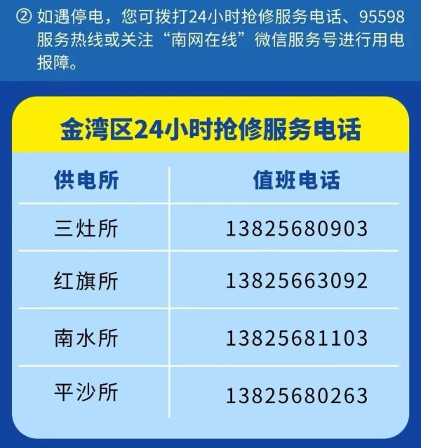 关于珠海市金湾区各供电所24小时抢修服务电话信息作出特别说明:本信息立足为社会大众提供有价值的参考资料和办事指南等公共信息,部分图文来源于网络或者有关机构公开内容,属于公益性的分享与传播。虽然尽力确保内容的准确性和实效性,但由于各种因素,难免存在疏忽和差错,敬请不吝赐教,欢迎相互交流,共同学习。对信息中陈述、观点判断保持中立,版权属原作者所有,如涉侵权或者差错等问题,请联系网络信息推广平台秋果黄页网客服(187/8199/3958微信同号),一定会及时删除或者修正。谢谢!