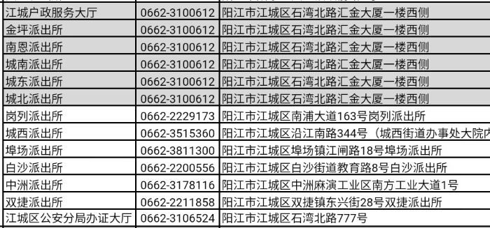 阳江市江城区户政服务大厅和派出所户籍窗口身份证业务咨询电话: