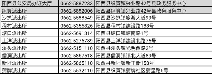 阳江市阳西县办证大厅和派出所办理身份证业务电话和地址:
