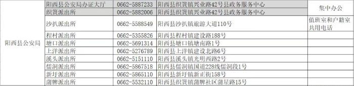 阳西县办理身份证的派出所户籍窗口办公电话和地址信息表如下: