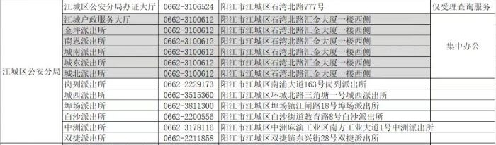 阳江市江城区办证大厅和派出所户籍窗口业务咨询电话:
