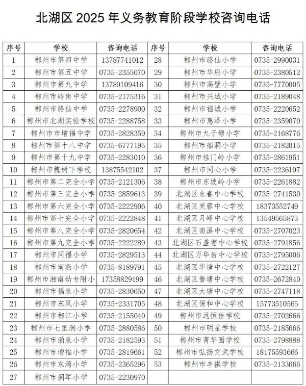 答:家长可通过“郴州市教育局”官网或公众号“郴州教育发布”、北湖发布、各义务教育阶段学校对外宣传栏及咨询电话查询义务教育阶段新生入学政策、划片范围和招生动态。如需咨询和投诉,可拨打区教育局的咨询电话:0735-2121075;监督电话:0735-2121068、2121071、2128312。区属各学校的招生入学咨询电话见后面附件。
