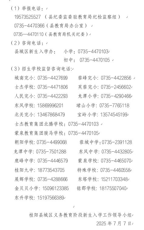 说明:关于桂阳县2025年城区义务教育阶段学校新生入学公告的信息仅供参考。