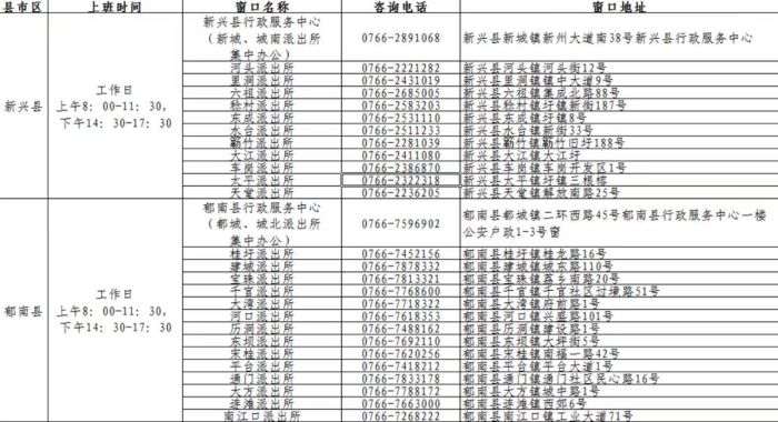 云浮市新兴县和郁南县各派出所户政业务窗口地址和咨询电话信息表