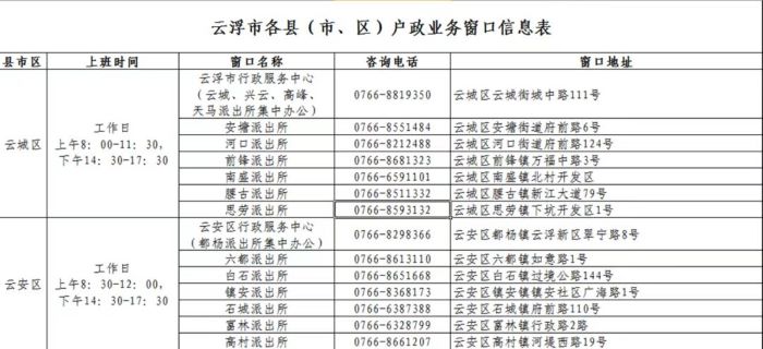 云浮市云城区和云安区行政服务中心和派出所户政业务窗口信息表
