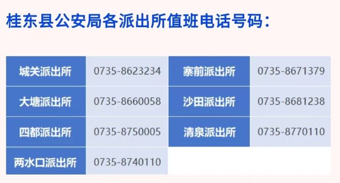 说明:关于桂东县各个基层派出所值班电话号码信息作出特别说明:本信息立足为社会大众提供有价值的参考资料和办事指南等公共信息,部分图文来源于网络或者有关机构公开内容,属于公益性的分享与传播。虽然尽力确保内容的准确性和实效性,但由于各种因素,难免存在疏忽和差错,敬请不吝赐教,欢迎相互交流,共同学习。对信息中陈述、观点判断保持中立,版权属原作者所有,如涉侵权或者差错等问题,请联系网络信息推广平台秋果黄页网客服(187/8199/3958微信同号),一定会及时删除或者修正。谢谢!